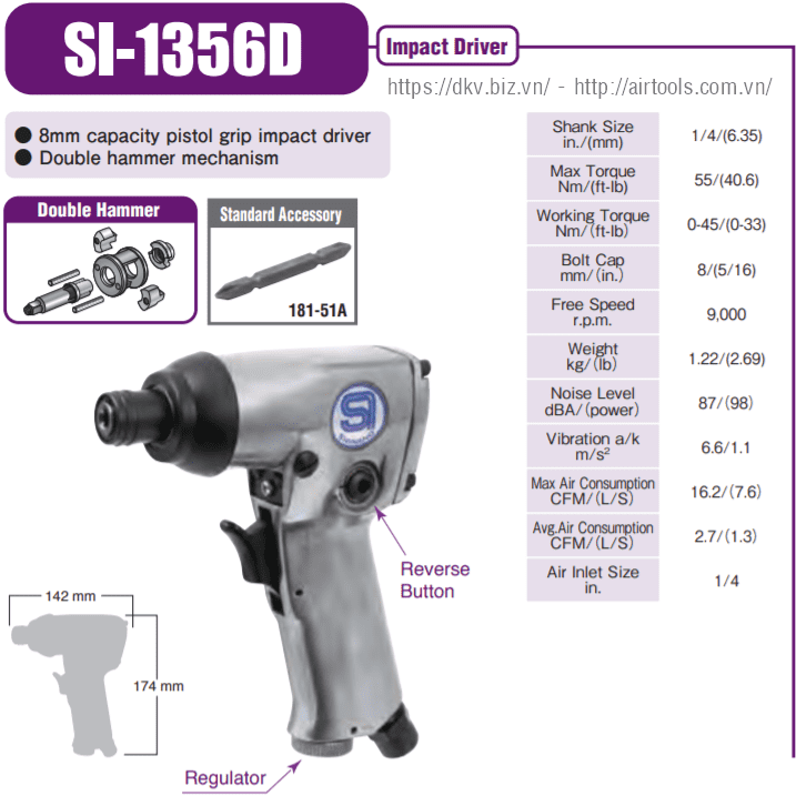 - Súng bắn vít khí nén Shinano SI-1356D có kích thước: 142x174 mm, trọng lượng: 1.22 kg.