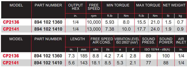 - Súng bắn vít khí nén Chicago Pneumatic CP2136 có lưu lượng: 4.2 l/s, tốc độ không tải: 10.000 rpm, dải lực siết hoạt động: 21 Nm.