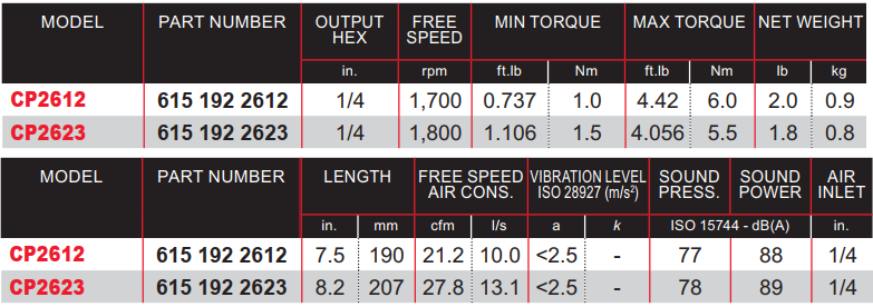 - Súng bắn vít khí nén Chicago Pneumatic CP2623 có chiều dài: 207 mm, trọng lượng: 0.8 kg.