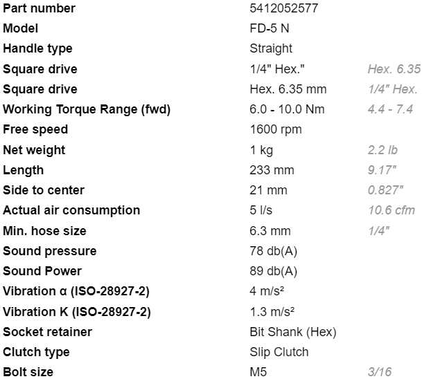 - Súng bắn vít khí nén Fuji FD-5 N, Fuji air screw driver FD-5 N: là súng bắn vít khí nén có size nhét vít: Hex.1/4" (6.35 mm), chuyên dùng để bắn - siết các loại vít trong công nghiệp.