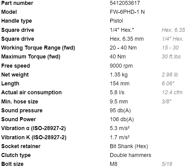 - Súng bắn vít khí nén Fuji FW-6PHD-1 N có tốc độ không tải: 9.000 rpm, dải lực siết hoạt động: 20 - 40 Nm.