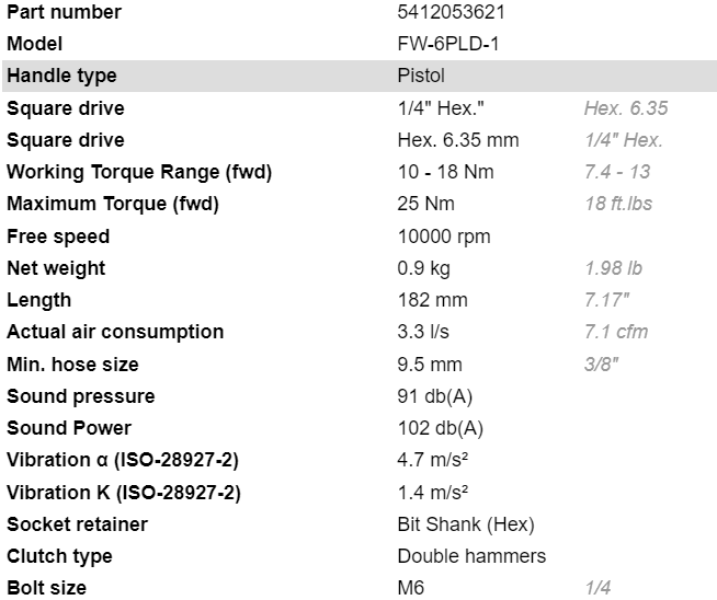 - Súng bắn vít khí nén Fuji FW-6PLD-1, Fuji air screw driver FW-6PLD-1: là súng bắn vít khí nén có size nhét vít: Hex.1/4" (6.35 mm), chuyên dùng để bắn - siết các loại vít trong công nghiệp.
