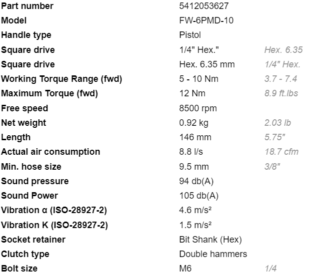 - Súng bắn vít khí nén Fuji FW-6PMD-10 có tốc độ không tải: 8.500 rpm, dải lực siết hoạt động: 5 - 10 Nm.