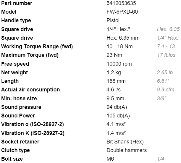 - Súng bắn vít khí nén Fuji FW-6PXD-60 có tốc độ không tải: 10.000 rpm, dải lực siết hoạt động: 10 - 18 Nm.
