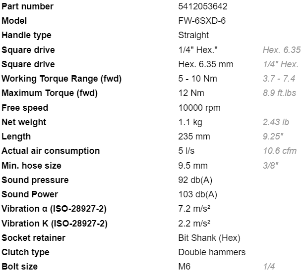 - Súng bắn vít khí nén Fuji FW-6SXD-6 có tốc độ không tải: 10.000 rpm, dải lực siết hoạt động: 5 - 10 Nm.