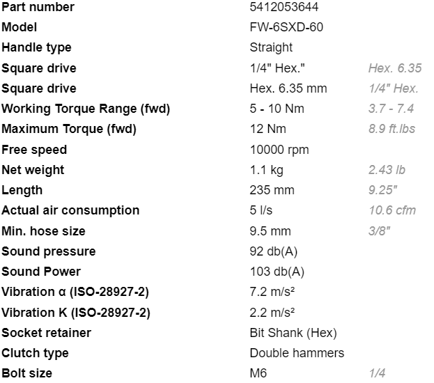 - Súng bắn vít khí nén Fuji FW-6SXD-60 có tốc độ không tải: 10.000 rpm, dải lực siết hoạt động: 5 - 10 Nm.