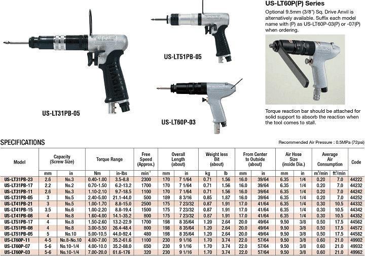 - Súng siết vít Uryu US-LT31PB-11, Súng siết vít khí nén Uryu US-LT31PB-11, Uryu pneumatic tools US-LT31PB-11: là loại súng siết vít, cài đặt được lực siết, khí nén, có lực siết max: 1.1 - 2.1 N.m , cỡ vít: 1/4", chuyên dùng để siết, vặn các loại vít trong công nghiệp.