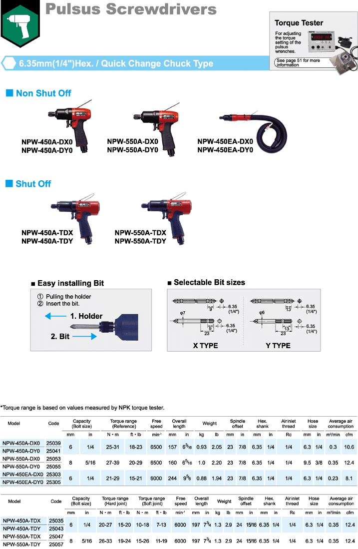 - Súng siết vít khí nén NPK NPW-550A-DX0, NPK air impact driver NPW-550A-DX0: chuyên dùng để siết (bắn) các loại vít từ 8 mm trở xuống trong công nghiệp, với dải lực siết khả dụng: 27 - 39 N.m, cỡ đầu kẹp vít: tiêu chuẩn lục giác hex.1/4" (hex 6.35 mm), tốc độ vòng quay trục chính max: 6.500 vòng/phút (khi không tải).