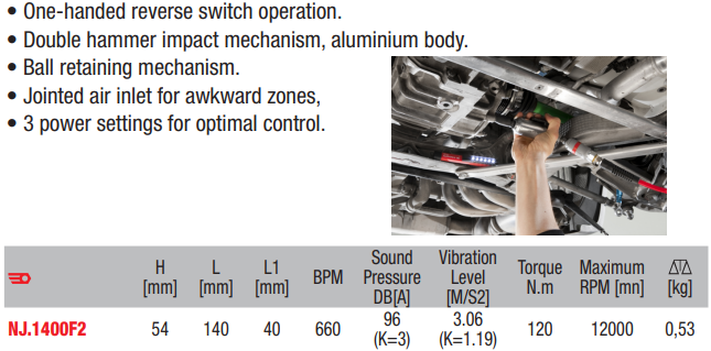 - Súng siết bulong khí nén Facom NJ.1400F2 có tốc độ không tải:12.000 rpm. Lưu lượng khí: 3.06 m/s², Độ ồn khi làm việc: 96 dbA, Áp khí nén hoạt động: max. 6,3 bar. Cơ cấu đảo chiều quay (chiều siết) cho phép đảo chiều nhanh, thuận tiện.