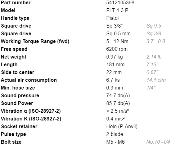 - Súng siết bulong khí nén Fuji FLT-4-3 P có tốc độ không tải: 6.200 rpm, gia tốc rung: Vibration α (ISO-28927-2) < 2.5 m/s². Độ ồn khi làm việc: 85.7 db(A).