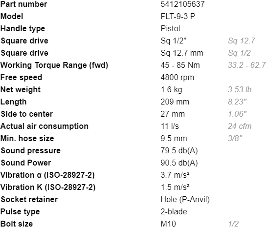- Súng siết bulong khí nén Fuji FLT-7-3 P có tốc độ không tải: 4.800 rpm, gia tốc rung: Vibration α (ISO-28927-2) 3.7 m/s². Độ ồn khi làm việc: 90.5 db(A).