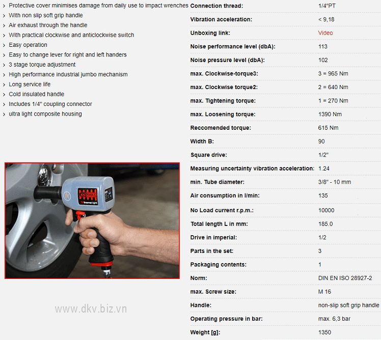 - Áp khí nén hoạt động: max. 6,3 bar., với đường ống dẫn khí nén có đường kính max: 3/8" (10 mm). Cơ cấu đảo chiều quay (trái/phải) bố trí trên mặt súng, thuận tiện khi thao tác.