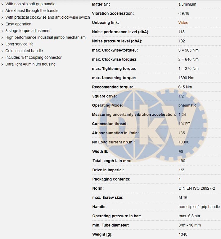 - Áp khí nén hoạt động: max. 6,3 bar., với đường ống dẫn khí nén có đường kính max: 3/8" (10 mm). Cơ cấu đảo chiều quay (trái/phải) bố trí trên mặt súng, thuận tiện khi thao tác.