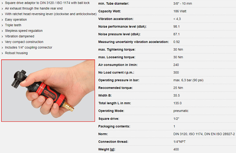 - Áp khí nén hoạt động: max. 6,3 bar., với đường ống dẫn khí nén có đường kính max: 3/8" (10 mm). Cơ cấu đảo chiều quay (trái/phải) bố trí trên mặt súng, thuận tiện khi thao tác.