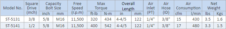 - Súng siết bulong khí nén Sumake ST-5131 có tốc độ không tải: 11.500 rpm, áp khí nén hoạt động: 430l/min.