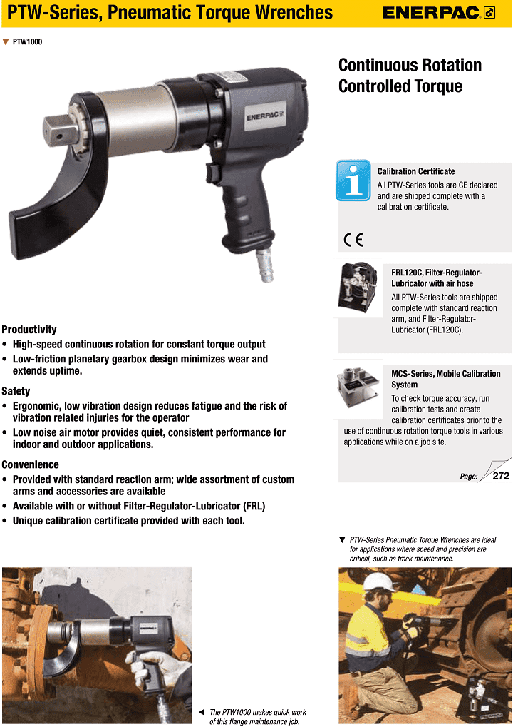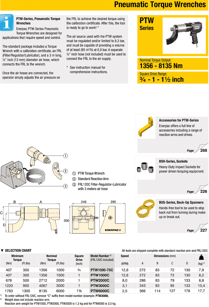 - Súng siết lực bulong khí nén Enerpac PTW1000-75, Enerpac air torque wrench PTW1000-75: là loại súng siết bulong cài đặt được lực siết chính xác, sử dụng nguồn khí nén, với dải lực siết: 407 - 1.356 N.m, cỡ khẩu: 3/4", chuyên dùng để siết lực (moment) chính xác các loại bulong cường độ cao trong công nghiệp.
