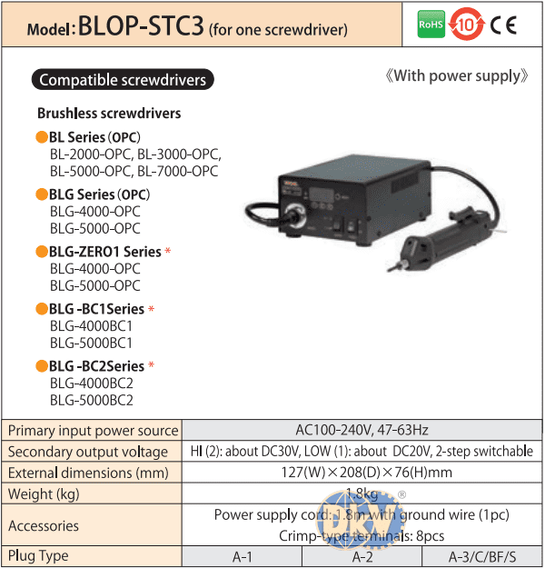 - Bộ điều khiển Hios BLOP-STC3 sử dụng điện 1 chiều DC với các tua vít tương ứng được đính kèm bên dưới. Sử dụng 1 dây cáp nguồn 1.8 m và trang bị nguồn điện đầu vào AC100-240V và đầu ra DC30V, DC20V giúp trang bị cho nhiều tuốc nơ vít khác nhau mà không cần thay thế bộ điều khiển.