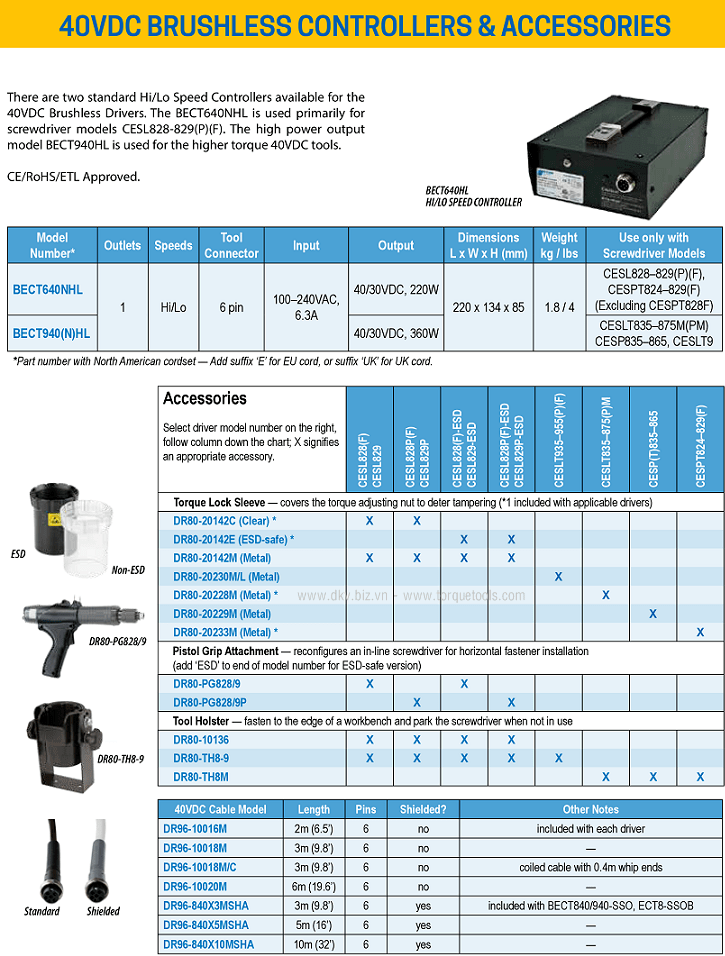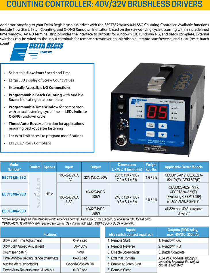 - Tô vít lực điện Delta Regis CESPT824 sử dụng điện 1 chiều DC (40V) thông qua bộ điều khiển kiêm đổi nguồn BECT640NHL hoặc BECT840N-SSO (100-240VAC, 6.3A - 40/32/24VDC, 200W). Tốc độ vòng quay không tải: 1.200 rpm.