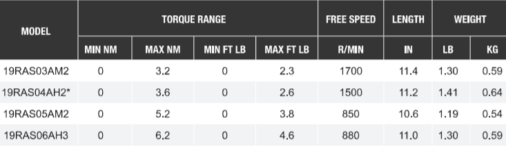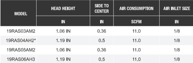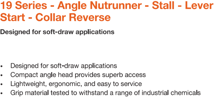 - Súng siết lực khí nén Cleco 19RAS03AM2, Cleco angle head pneumatic nutrunners 19RAS03AM2: thuộc dòng sản phẩm 19 Series của Cleco, có dải lực siết 0 - 3.2 N.m, cỡ khẩu 1/4", chuyên dùng để siết bulong, đai ốc có lực chính xác trong công nghiệp.