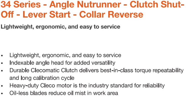 - Súng siết lực khí nén Cleco 34RAA68AZ4, Cleco angle head pneumatic nutrunners 34RAA68AZ4: thuộc dòng sản phẩm 34 Series của Cleco, có dải lực siết 34 - 68 N.m, cỡ khẩu 1/2", chuyên dùng để siết bulong, đai ốc có lực chính xác trong công nghiệp.