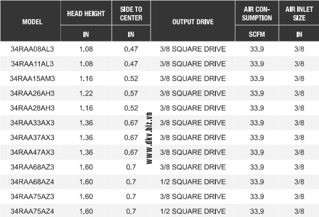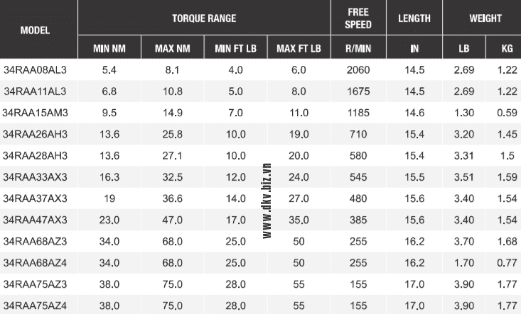 - Súng siết lực khí nén Cleco 34RAA68AZ4 là loại súng vuông góc, tốc độ không tải đạt 255 rpm (vòng/phút). Chiều dài tổng thể 411.5 mm. Trọng lượng: 0.77 kg.