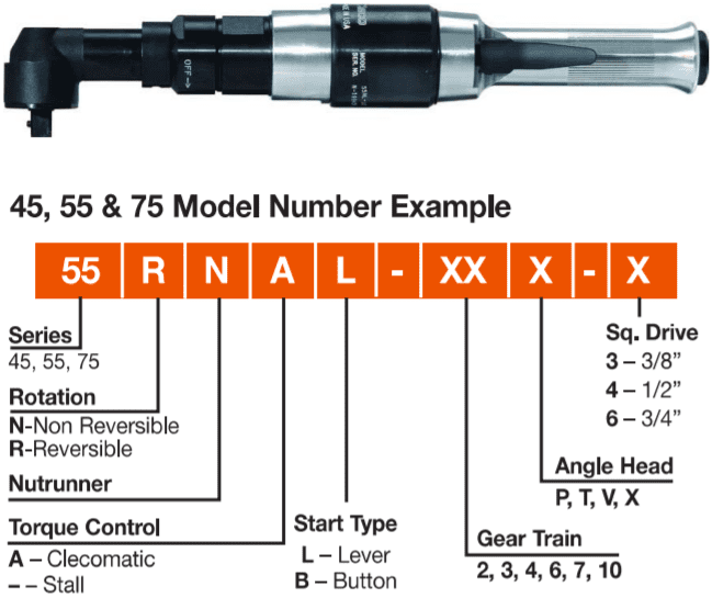 - Súng siết lực khí nén Cleco 55RNL-2T-4, Cleco angle head pneumatic nutrunners 55RNL-2T-4: thuộc dòng sản phẩm 55/75 Series của Cleco, có dải lực siết 0 - 176 N.m, cỡ khẩu 1/2", chuyên dùng để siết bulong, đai ốc có lực chính xác trong công nghiệp.