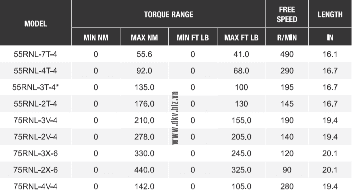 - Súng siết lực khí nén Cleco 55RNL-2T-4 là loại súng vuông góc, tốc độ không tải đạt 145 rpm (vòng/phút). Chiều dài tổng thể 424.2 mm. Trọng lượng: 2.95 kg.