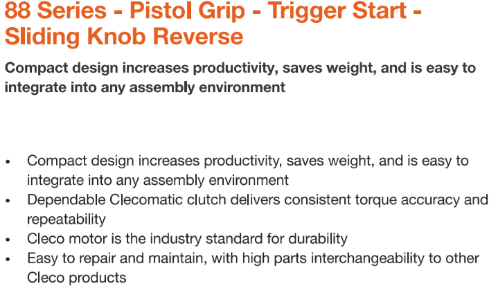 - Súng siết lực khí nén Cleco 88RSATP-7CQ, Cleco pneumatic nutrunners 88RSATP-7CQ: thuộc dòng sản phẩm 88 Series của Cleco, có dải lực siết 1.7 - 10 N.m, cỡ khẩu hex 1/4", chuyên dùng để siết bulong, đai ốc có lực chính xác trong công nghiệp.