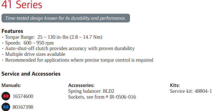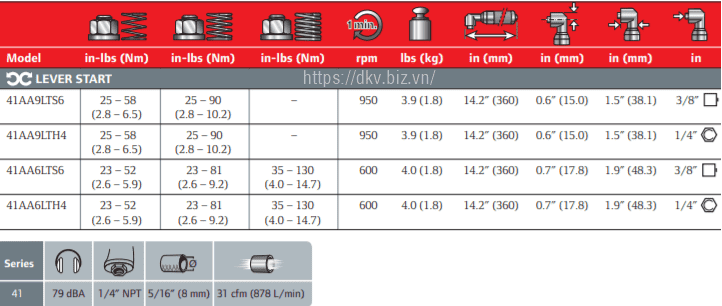 - Súng siết lực khí nén Ingersoll Rand 41AA9LTH4 là loại súng vuông góc, tốc độ không tải đạt 950 rpm (vòng/phút). Chiều dài tổng thể 360 mm. Trọng lượng: 1.8 kg.
