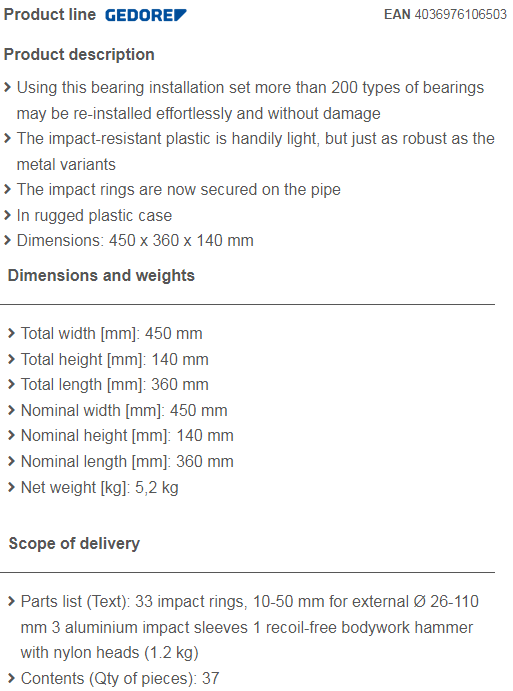 - Bộ đóng vòng bi bạc đạn Gedore 1.85/1 gồm 37 chi tiết: 1 búa nhựa (1.2 kg), 3 trục đóng và 33 bích đóng vòng bi (Ø 10 ÷ 110 mm).