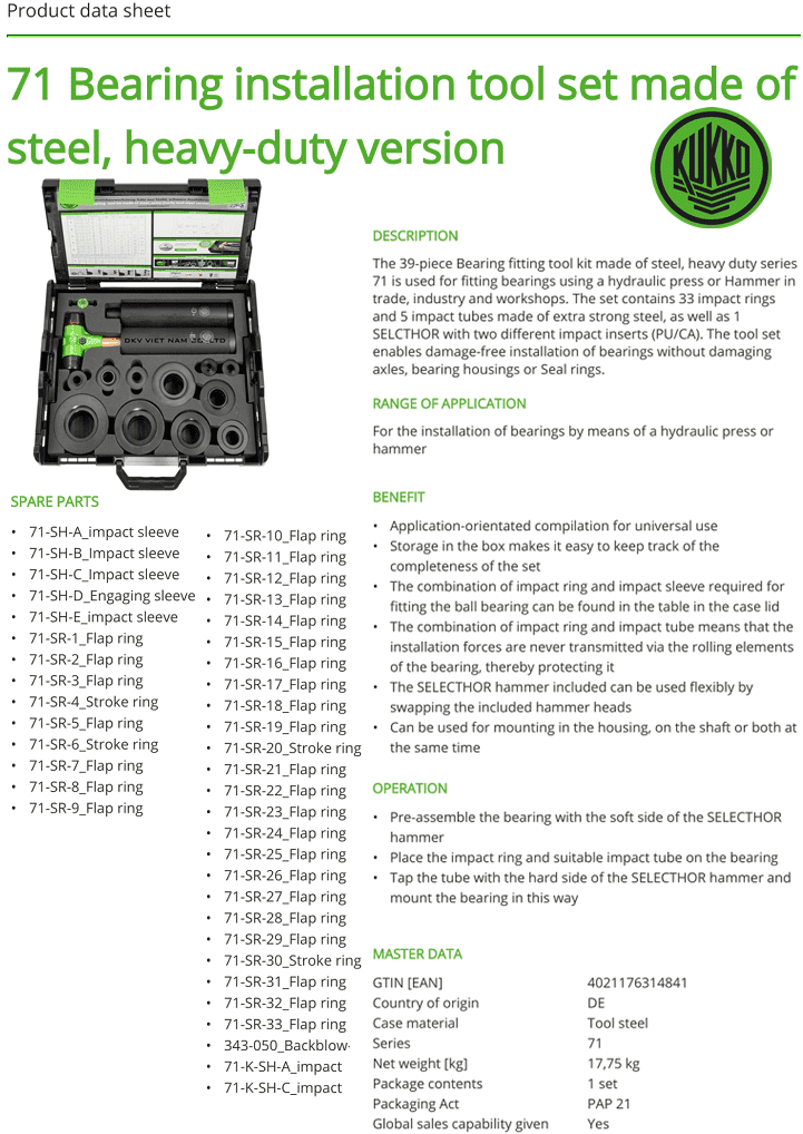 - Bộ đóng vòng bi bạc đạn Kukko 71, Kukko impact fitting tool kit 71: là bộ dụng cụ chuyên dùng để đóng nguội vòng bi bạc đạn, chịu tải lớn của các hãng vòng bi nổi tiếng: SKF, FAG, Timken, Nachi, Koyo, NSK, NTN, IKO, dải đóng vòng bi trong Ø10 ÷ 50 mm, dải đóng vòng bi ngoài: Ø 26 ÷ 110 mm.