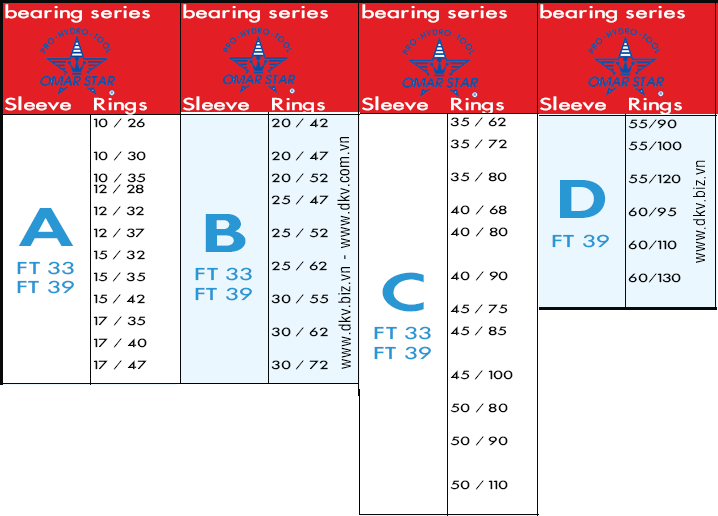 - Bộ đóng vòng bi bạc đạn Omarstar FT33 gồm 1 búa nhựa, 3 trục đóng (A, B và C) và 33 bích đóng vòng bi (Ø 26, 28, 30, 32, 35, 37, 40, 42, 47, 52, 55, 62, 68, 72, 75, 80, 85, 90, 100 và 110 mm).