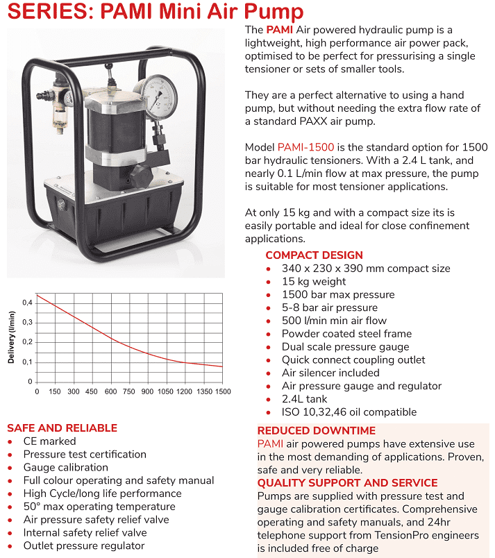 - Bơm căng bulong thủy lực khí nén TensionPro PAMI-1500, TensionPro Air tensioner pumps PAMI-1500 có dung tích thùng dầu: 2.4 lít, áp hoạt động < 1.500 bar (< 21.750 psi). Bơm căng bulong thủy lực TensionPro PAMI-1500 chuyên dùng cho căng bulong thủy lực đơn chiếc hoặc hệ thống căng bulong thủy lực hoạt động cùng lúc thông qua bộ chia.