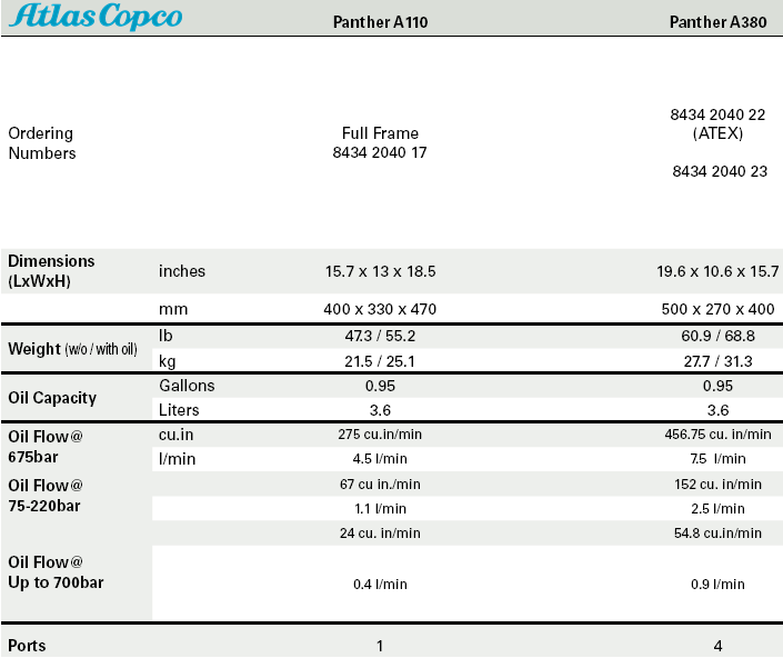 - Bơm cờ lê thủy lực Atlas Copco Panther A110 sử dụng động cơ khí nén, với lưu lượng đẩy dầu: 4.5 /0.4 lít/phút tại 67.5/700 bar.
