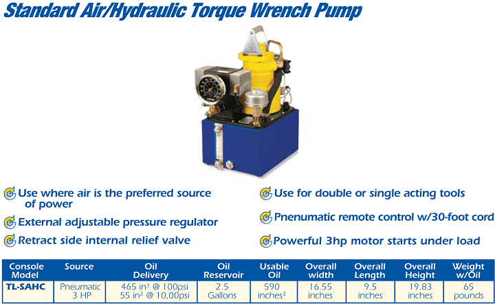 - Bơm cờ lê thủy lực Torqlite TL-SAHC sử dụng động cơ khí nén 3HP, với lưu lượng đẩy dầu: 55in3/phút tại 700 bar. Sử dụng đồng hồ cơ (analog).