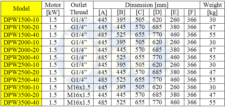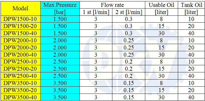 - Bơm điện thủy lực cao áp 1500 bar DPW1500-10 sử dụng động cơ: 1.5 kW, 380V/50Hz/3ph hoặc 220V/50Hz/1ph, với lưu lượng đẩy dầu: 3/0.3 lít/phút tại 0/1.500 bar. Có thể lựa chọn động cơ lớn hơn để cho lưu lượng đẩy dầu lớn hơn theo ý khách hàng.