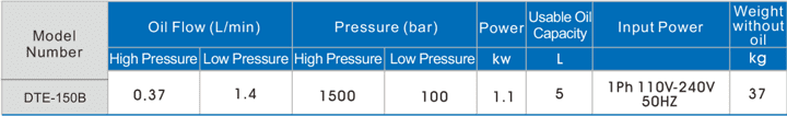 - Bơm điện căng bulong thủy lực DTE-150B sử dụng động cơ: 1.1 kW, 220V/50Hz/1ph, với lưu lượng đẩy dầu: 1.4/0.37 lít/phút tại 100/1.500 bar.