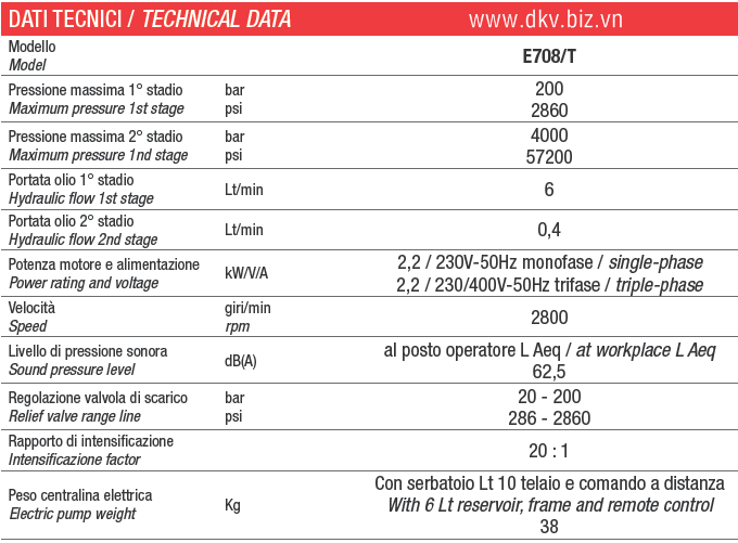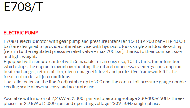 - Bơm thủy lực cao áp Olmec E708/T động cơ: 2.2 kW/400V/50Hz/3ph hoặc 230V/50Hz/1ph (tốc độ vòng quay động cơ: 2.800 rpm, độ ồn max: 62.5 dB(A)) , với lưu lượng đẩy dầu: 0.4 lít/phút tại 4.000 bar.