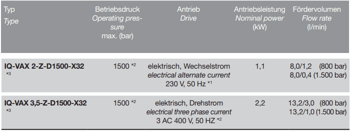 - Bơm điện thủy lực cao áp Plarad IQ-VAX 2-Z-D1500-X32 sử dụng động cơ: 1.1 kW, 230V/50Hz/1ph, với lưu lượng đẩy dầu: 8.0/0.4 lít/phút tại 1.500 bar (< 21.750 psi).