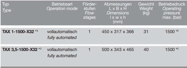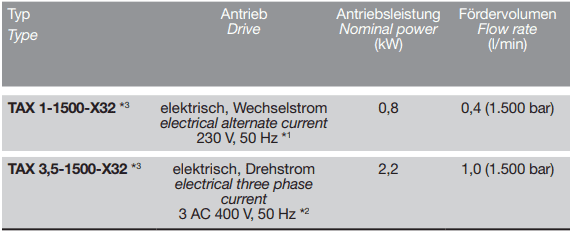 - Bơm điện thủy lực cao áp Plarad TAX 1-1500-X32 sử dụng động cơ: 0.8 kW, 230V/50Hz/1ph, với lưu lượng đẩy dầu: 0.4 lít/phút tại 1.500 bar (< 21.750 psi).