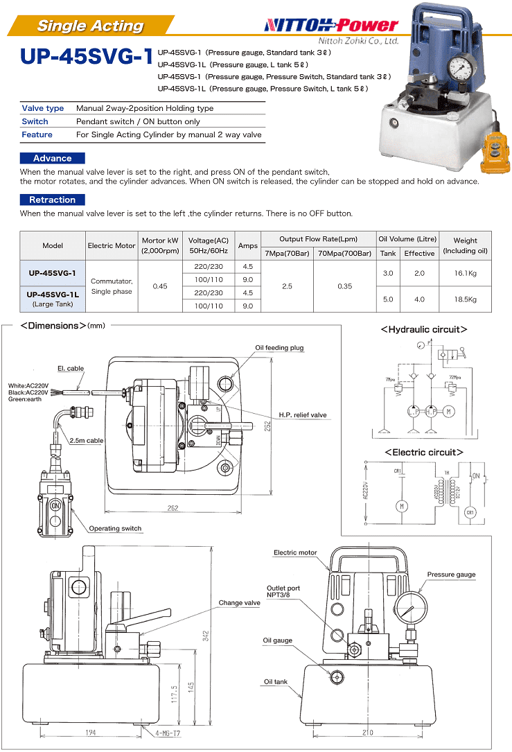 - Bơm thủy lực Nittoh Power UP-45SVG-1L sử dụng động cơ: 0.45 kW/220V/50Hz/1ph., tốc độ vòng quay động cơ max: 2.000 rpm. Lưu lượng đẩy dầu: 2.5/0.35 lít/phút tại 10/700 bar.