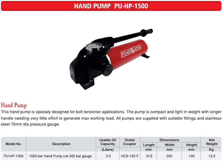 - Bơm thủy lực cao áp Powermaster PU-HP-1500, Powermaster ultra-high pressure hydraulic hand pump PU-HP-1500: là loại bơm thủy lực cao áp, có dung tích sử dụng dầu hữu ích 3 lít, áp hoạt động < 1.500 bar, chuyên dùng cho kích thủy lực, tools thủy lực 1 chiều cao áp (căng bulong thủy lực) trong công nghiệp.