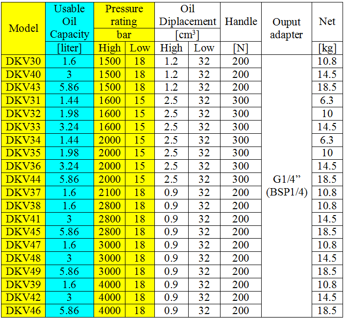 - Bơm thủy lực cao áp 3000 bar DKV47 thuộc dạng 2 cấp tốc độ, lưu lượng đạt 0.9 cm3/hành trình đẩy tay tại 3000 bar, với đầu ren chờ kết nối tiêu chuẩn 1/4"-BSP (G1/4"), cho phép đấu nối nhanh với kích và tools thủy lực thông qua ống dây thủy lực, phụ kiện. Lực đẩy căng tay tại cao áp (300 MPa) đạt max: 200 N.m.