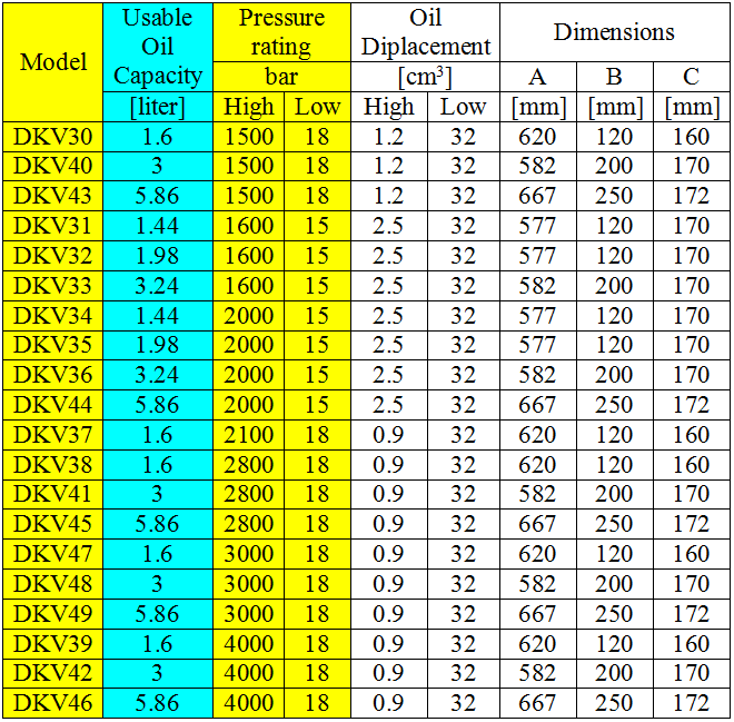 - Bơm thủy lực cao áp 3000 bar DKV47 có quy cách: kích thước tổng thể (dài x rộng x cao): 620 x 120 x 160 mm. Chế tạo thân vỏ bằng hợp kim nhôm, lên trọng lượng nhẹ, trọng lượng: 10.8 kg.