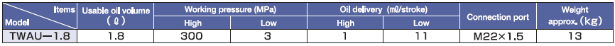 - Bơm thủy lực 3000 bar, Bơm tay thủy lực Osaka TWAU-1.8, bơm tay thủy lực cao áp Osaka TWAU-1.8, Osaka high pressure hydraulic pump TWAU-1.8: là loại bơm thủy lực cao áp, có áp hoạt động: 0 - 300 MPa (0 - 3.000 bar), dung tích dầu: 1.8 lít, lưu lượng: 1 ml/hành trình (tại 300 MPa).