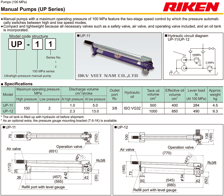 - Bơm tay thủy lực cao áp Riken UP-12 là sản phẩm bơm tay thủy lực cao áp hoạt động 1 chiều, thuộc dạng bơm chân có 2 cấp độ, với dung tích chứa dầu: 1 lít, dung tích hữu dụng: 0.85 lít, áp hoạt động < 1.000 bar (100 Mpa), lưu lượng đẩy dầu đạt: 2.3 cm3/hành trình (tại 1.000 bar), được trang bị đầu ren chờ kết nối tiêu chuẩn Rc-3/8", cho phép đấu nối nhanh với kích thủy lực 1 chiều và tools thủy lực 1 chiều thông qua ống dây thủy lực và đầu nối nhanh.