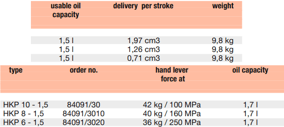 - Bơm tay thủy lực Lukas 84091/3010, bơm tay thủy lực cao áp Lukas 84091/3010, Lukas high pressure hydraulic pump 84091/3010: là loại bơm tay thủy lực cao áp 1 chiều, thân vỏ thép, có dung tích chứa dầu 1.5 lít, áp hoạt động < 1.600 bar (160 MPa), chuyên dùng cho kích và tools thủy lực cao áp 1 chiều.