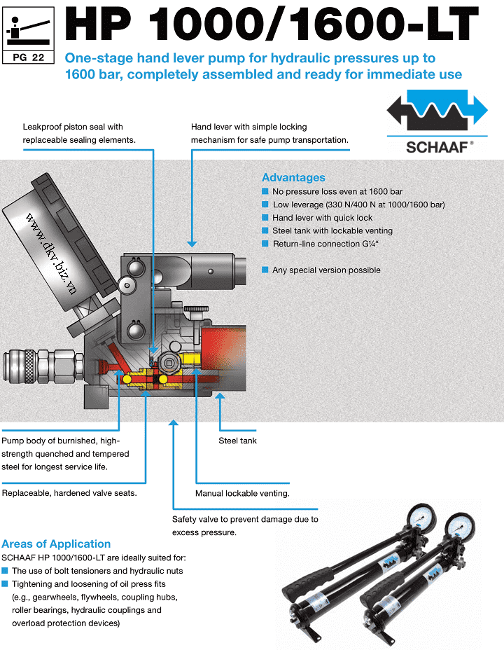 - Bơm tay thủy lực Schaaf HP 1600-LT, bơm tay thủy lực cao áp Schaaf HP 1600-LT, Schaaf high pressure hydraulic pump HP 1600-LT: là loại bơm tay thủy lực cao áp 1 chiều, 1 cấp tốc độ thân vỏ thép, có dung tích chứa dầu 0.9 lít, dung tích dầu hữu dụng: 0.8 lít, áp hoạt động < 1.600 bar (160 MPa), chuyên dùng cho kích và tools thủy lực cao áp 1 chiều.
