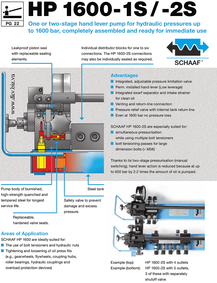 - Bơm tay thủy lực Schaaf HP 1600-2S, bơm tay thủy lực cao áp Schaaf HP 1600-2S, Schaaf high pressure hydraulic pump HP 1600-2S: là loại bơm tay thủy lực cao áp 1 chiều, 2 cấp tốc độ, thân vỏ thép, có dung tích chứa dầu 3.7 lít, dung tích dầu hữu dụng: 3.4 lít, áp hoạt động < 1.600 bar (160 MPa), chuyên dùng cho kích và tools thủy lực cao áp 1 chiều.