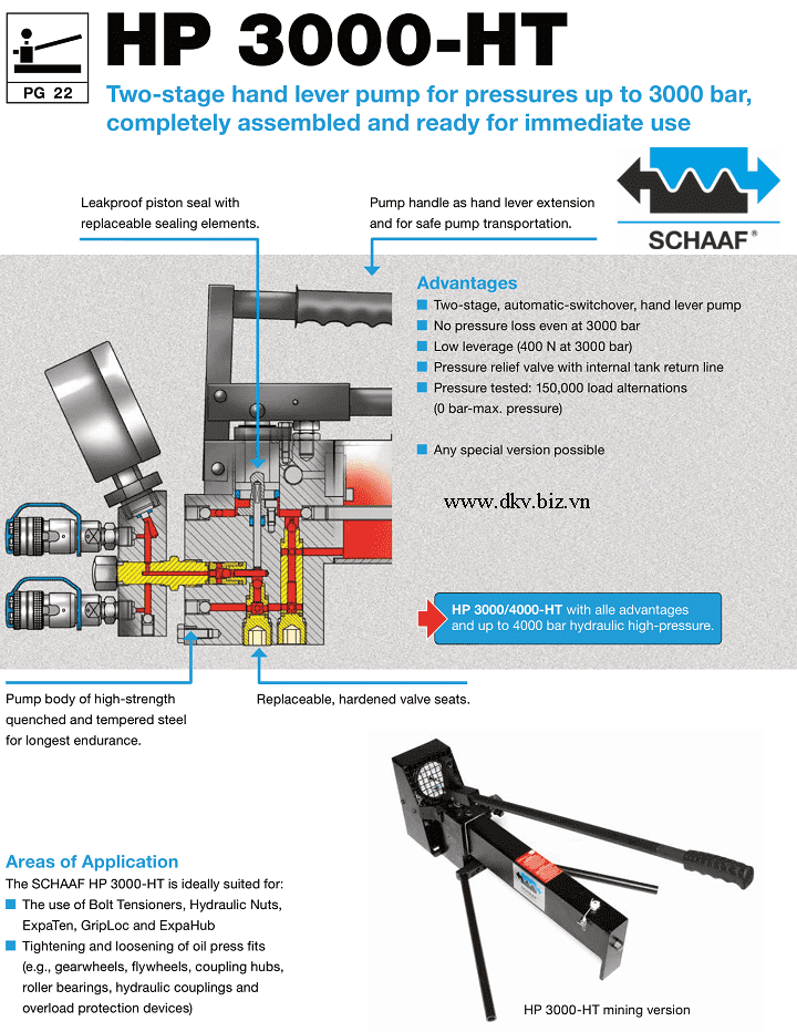 - Bơm tay thủy lực Schaaf HP 3000-HT, bơm tay thủy lực cao áp Schaaf HP 3000-HT, Schaaf high pressure hydraulic pump HP 3000-HT: là loại bơm tay thủy lực cao áp 1 chiều, thân vỏ hợp kim nhôm, có dung tích chứa dầu 1.9 lít, dung tích dầu hữu dụng: 1.7 lít, áp hoạt động < 3.000 bar (300 MPa), chuyên dùng cho kích và tools thủy lực cao áp 1 chiều.